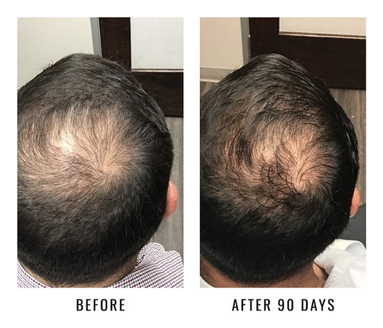 Patient with male pattern baldness showing results after using UnTangled + Hair Serum with OTC 5% Minoxidil foam for 90 days.